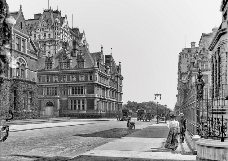 “The picturesque gables of the Fifth Avenue front successfully counterbalance the ornate dormers facing Central Park. The relation of the upper loggias to the breaks in the front wall has been skillfully worked out. It is these subtleties of design, as well as many attractive details, which make the hotel so satisfying architecturally…the main facades are tripartite in composition, being composed of a recessed central portion with projected terminal sections at each corner. Vertically, they consist of a base, a shaft and a crown, each clearly marked off by horizontal string courses or balconies for emphasis. The base consists of three stories of marble, two of which are rusticated. The shaft is formed by ten floors of white brick topped by a marble balcony which casts a band of deep shadow. The crown consists of the top five floors including the gables on the Avenue side and steep slate roofs with their dormers facing the park. The two corners of the rusticated base on the east side are rounded, and flow logically upward into turrets which rise uninterruptedly for fourteen floors, through shaft and roof crown, and are terminated by small domed roofs.”